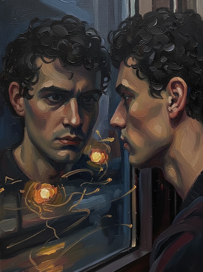 Miradas entre las sombras se reflejan en la ventana inesperadamente. Sintiéndose observado, Gio desvía sus ojos del encantamiento de la noche, para concentrarse en esos ojos que se reflejan en la ventana de su paisaje. Se detiene un instante. Su respiración, antes en alivio, se altera momentáneamente en coro al ritmo intranquilo de su corazón. Del sonido de la noche, faltaba tan maravillosa percusión: El pum-pum irregular surgido de su pecho, el reflejo de los oscuros ojos en la ventana, la lucidez rojiza de los semáforos intermitentes y disfuncionales de la noche, la ausencia momentánea de la fricción de las llantas, y el silencio inusual de la sala, se torna en la viva expresión de la obra de arte por él vislumbrada. ¿Qué se podría esperar de esa mirada reflejada en la ventana, si su taciturna presencia era apenas evidente en la creación de su pintura bosquejada?