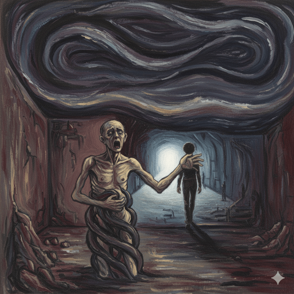 Pronto, su vista se hundió en el suelo de la habitación. Se enfrenta a la soledad que él mismo había elegido al alejarse de su pareja, de su familia y sus amigas y amigos, convencido de que así los protegería de su amargura y declive permanente. No sabía la causa de su tristeza en ese momento, aunque la descubriría años después. Se atormentaba por su hastío con el calor insoportable del apartamento; y por su estupor ante todo contacto social que era, además de necesario, el foco de su labor. Observando sus manos temblorosas, siente el frio sudor que baja por su cuello y baña todo su cuerpo, y ante cualquier intento de moverse, las piernas entumidas lo obligaban a aferrarse a su cama, a pesar de su desesperación por huir. Estaba allí, sintiendo que no podía escapar, y tampoco podía ver que tuviese más posibilidades, porque era más grande el deseo del dinero por el trabajo bien remunerado. Según él, este trabajo le permitiría conseguir más rápido el vehículo que tanto había deseado, un deseo que se había incrustado en él desde niño. Y ante esta decisión, debido al miedo por enfrentar algo diferente, su aferramiento a la comodidad fue más fuerte que la búsqueda de su propia paz.